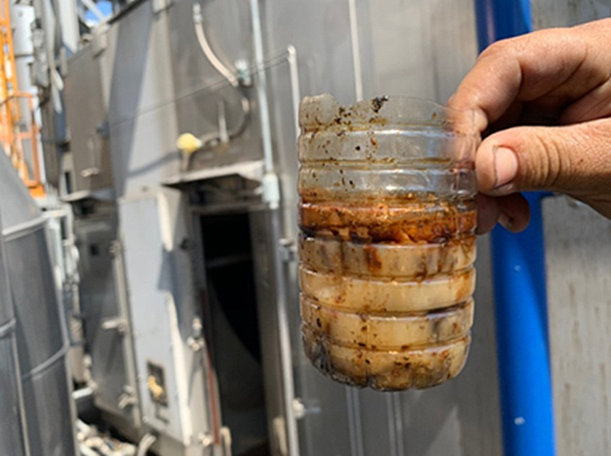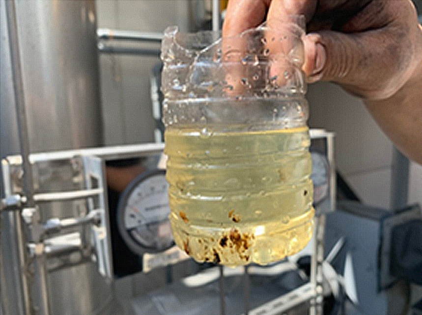 圖4為再生型次微米高效油霧過濾單元運轉6個月後進行再生處理之前系統所攔截收集下來的油霧廢液,從圖十二中可以清楚看到經長時間運轉被過濾單元攔截下來的油霧(含水) 液體呈現不透明黏稠乳化狀態,顯示過濾裝置表面已大量附著黏稠性高沸點化合物,導致壓降過高,需啟動再生程序進行濾材再生處理。圖5為系統經再生程序後所攔截之油霧廢液照片,從照片中可清楚看到系統所收集的廢液呈現半透明狀態,與再生前有天壤之別,顯示系統之再生程序可確實去除濾材表面附著的黏稠性物質,達到濾材再生及重複使用之效果。