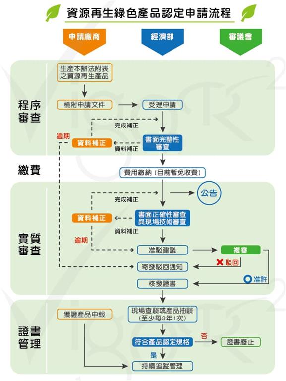 資源再生綠色產品認定申請案件之審查作業流程圖如所示。其流程內容包括: